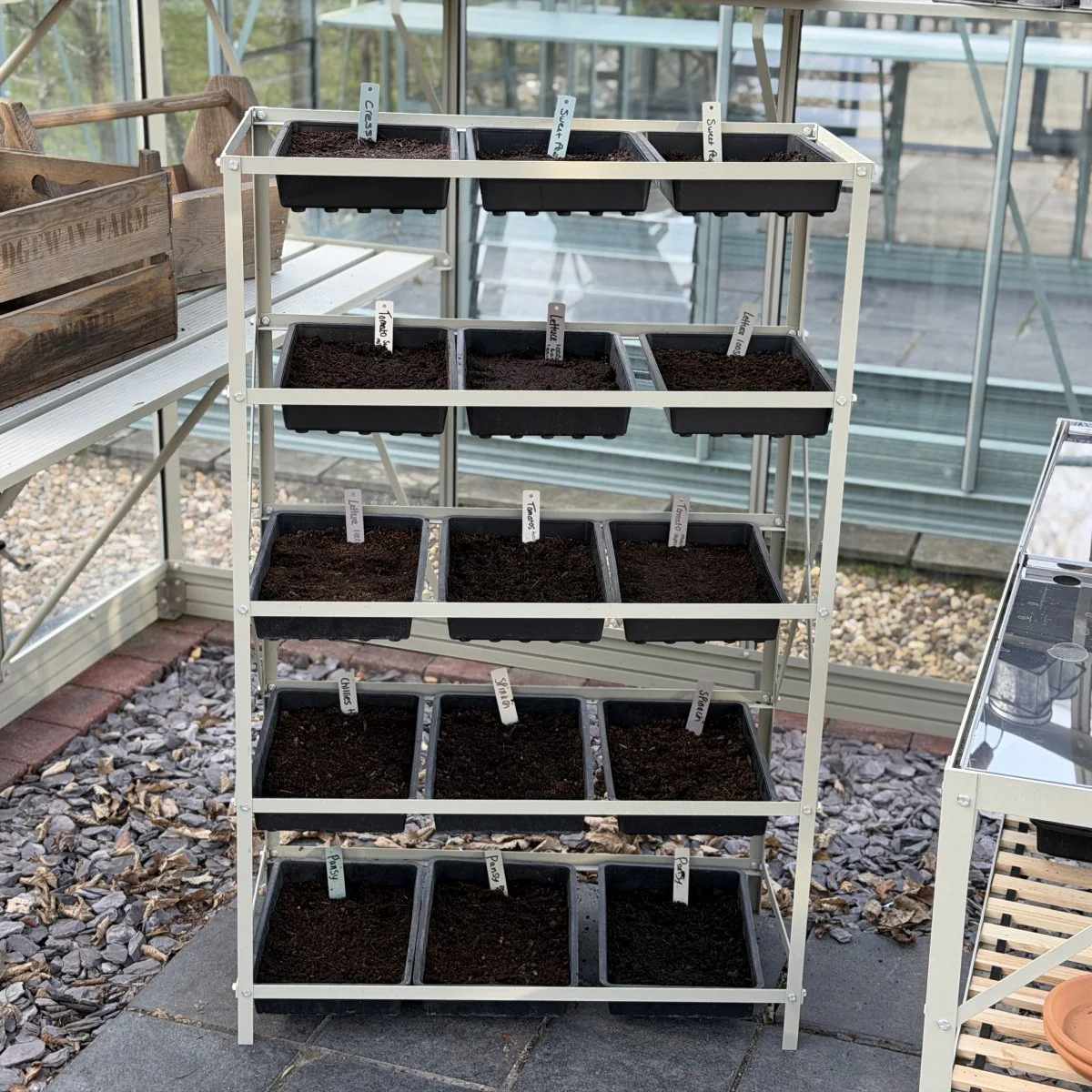 The Rhino Seedrack comes in handy, taking up very little floor space (in fact the space of just three seed trays), it will store fifteen trays. You can also colour match your seedrack to your Rhino Greenhouse!