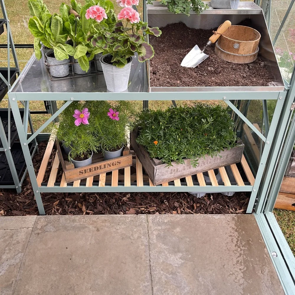Growing needs can change throughout the seasons, with our free-standing staging you can customise and adapt your space as and when needed to provide space for those taller crops. The upper tier, complete with two stainless steel tray tops is perfect for use as a workspace and for potting up, while the lower tier provides a brilliant storage space for compost bags, empty pots and even your tools.
